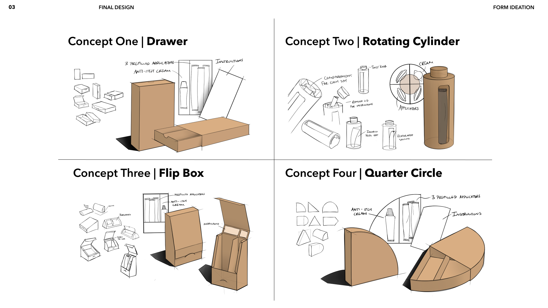 4 clear directions for packaging were defined. Based on user testing and evaluation of potential materials for each, elements from concept 1 and concept 3 were combined.