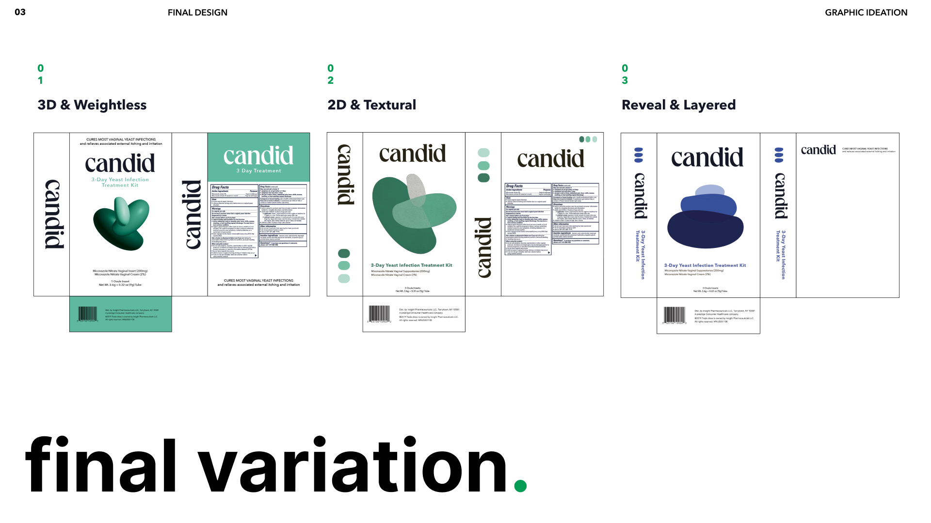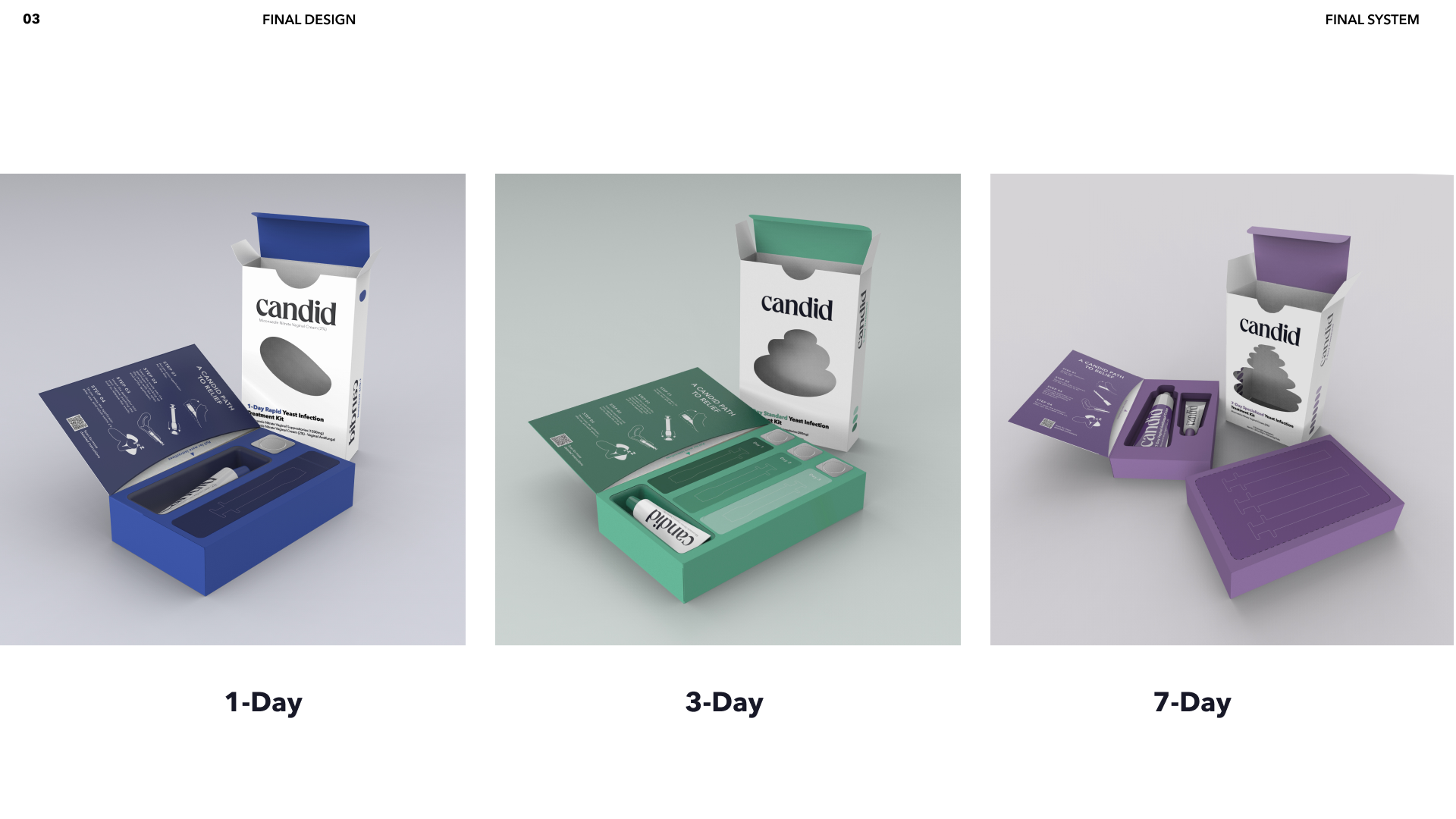 The final color palette for Candid utilizes the existing color convention that other treatment kits use. Where blue is the 1-Day treatment, green is the 3-Day treatment, and purple is the 7-day treatment