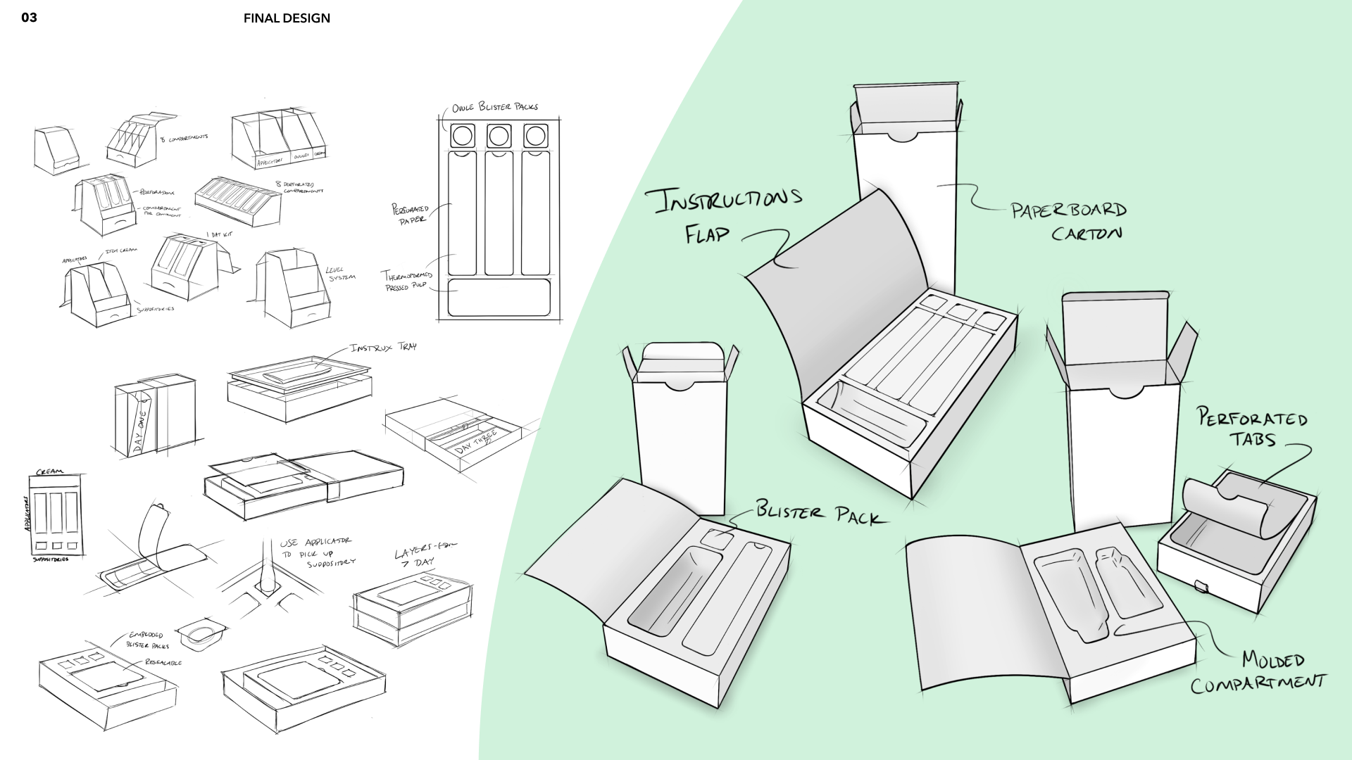 The final product design allows for each component of the internal packaging to be presented to the user in the series of steps that they would take to use the treatment. Additionally, this means that each component can be stored neatly without risking losing any pieces or the sanitation of the product.